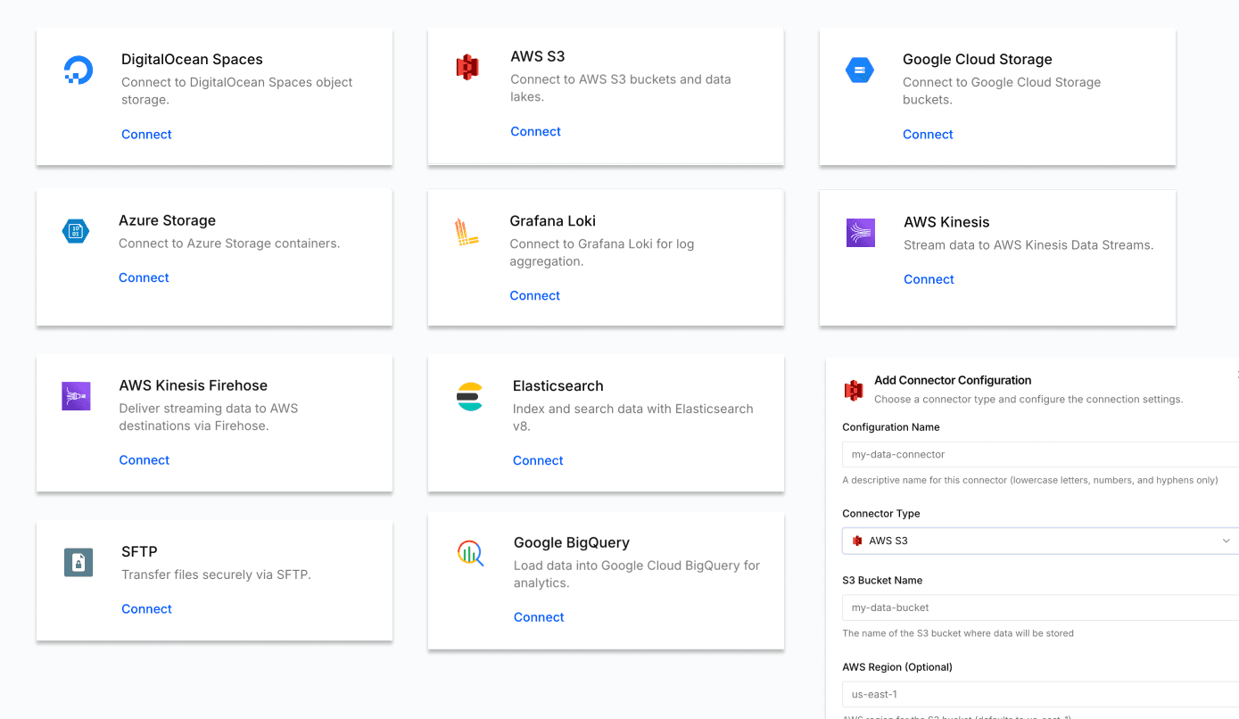 Data Bridge is a new connection layer that lets you push any data flowing through Voltra to the external platform of your choice. Connect to AWS S3, Google Cloud Storage, Azure Storage, Google BigQuery, Elasticsearch, Grafana Loki, AWS Kinesis, AWS Kinesis Firehose, DigitalOcean Spaces, or SFTP — and route your data there automatically.